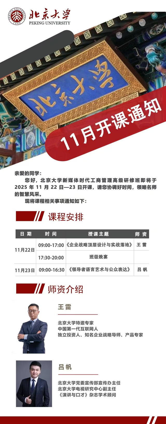 您好,北京大学新媒体时代工商管理高级研修班即将于2025年11月22日—23日开课,请您协调好时间,领略名师的智慧风采。