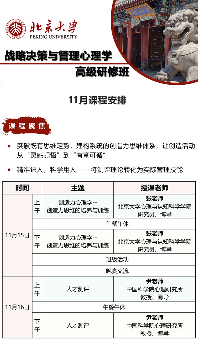北京大学战略决策与管理心理学高级研修班11月课程安排 |