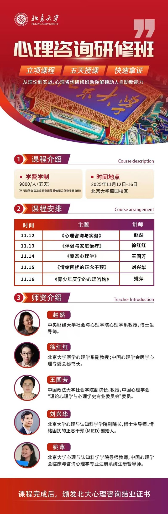 北京大学心理学咨询研修班【开课时间】 2025-11-12
